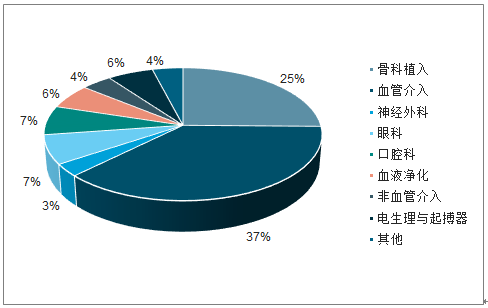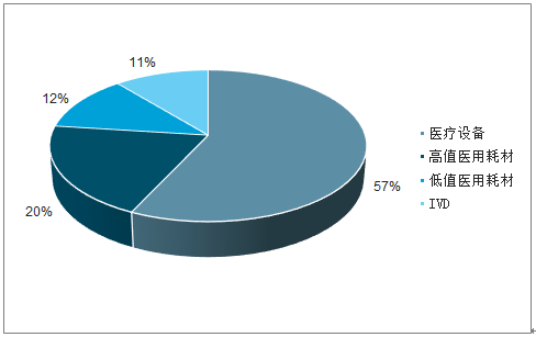 根据医械研究院分类,医疗器械可以分为高值医用耗材、低值医用耗材、医疗设备、IVD(体外诊断)四大类。其中高值医用耗材市场分为骨科植入、血管介入、神经外科、眼科、口腔科、血液净化、非血管介入、电生理与起搏器、其他共九小类。2018年医疗设备市场依然是中国医疗器械最大的细分市场,市场规模约为3013亿元,占比56.80%;其次为高值医用耗材市场,市场规模约为1046亿元,占比19.72%。
