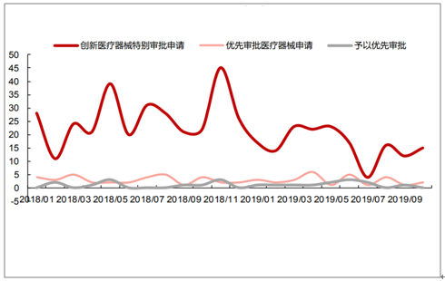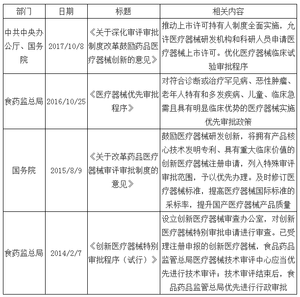 顶层设计推动创新医疗器械加速面世。2016年前食药监总局发布《医疗器械优先审批程序》,对符合诊断或治疗罕见病、恶性肿瘤、老年人特有和多发疾病、儿童、临床急需且具有明显临床优势的医疗器械实施优先审批政策;2017年10月国务院办公厅发布《关于深化审评审批制度改革鼓励药品医疗器械创新的意见》,发展特别审批制度、优先审批制度推动创新医疗器械上市。优先审评制度可解决注册申请积压,提高审评质量,利好国内创新医疗器械产品及公司,加速产品上市速度。