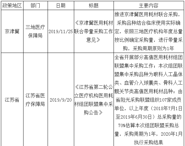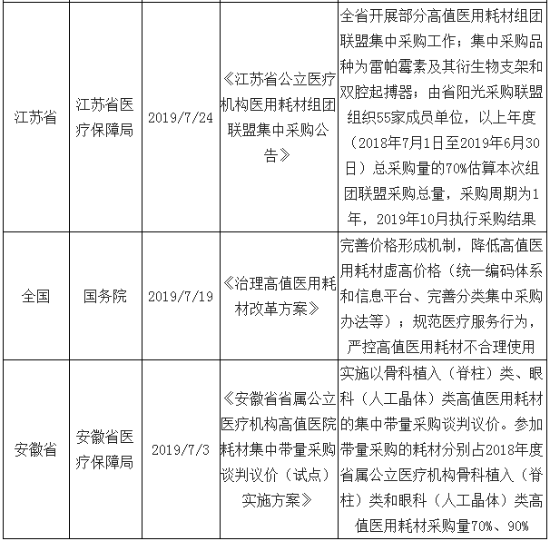 2019年7月国务院办公厅日前印发《治理高值医用耗材改革方案》,提出鼓励医疗机构联合开展带量谈判采购、统一编码体系和信息平台等,以严格控制高值医用耗材不合理使用的情况。2019年7月24日,江苏省医保局跟进国家政策,启动第一轮冠状动脉和双腔起搏器带量采购,并于2019年9月开启第二次眼科人工晶体类、血管介入球囊类、骨科高耗材产品集中采购。安徽省也于2019年7月推进骨科类、眼科类高值耗材的集中带量采购谈判议价。