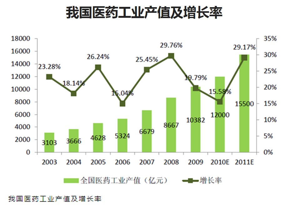 医药行业是我国国民经济的重要组成部分,是传统产业和现代产业相结合,一、二、三产业为一体的行业。其主要门类包括:化学原料药及制剂、中药材、中药饮片、中成药、抗生素、生物制品、生化药品、放射性药品、医疗器械、卫生材料、制药机械、药用包装材料及医药商业。医药行业对于保护和增进人民健康、提高生活质量以及对计划生育、救灾防疫、军需战备和促进经济发展、社会进步均具有十分重要的作用。由下图可知,我国医药行业近几年发展迅猛。