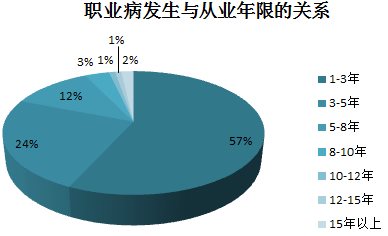 由上图可知,发病者中工作1-3年的比例为56.8%,3-5年的为24.1%,工作10年-15年的为0.9%,职业病的发生概率随着工作年限提高而逐渐降低,由此可得知,职业病的发生是人为可控的,具体可从以下几个方面做起: