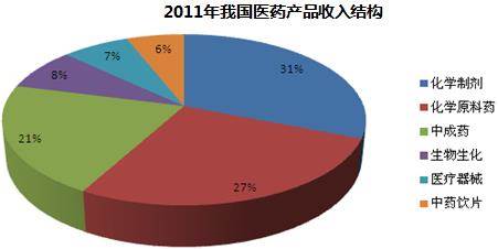 医药行业是我国国民经济的重要组成部分,是传统产业和现代产业相结合,一、二、三产业为一体的产业。其主要门类包括:化学原料药及制剂、中药材、中药饮片、中成药、抗生素、生物制品、生化药品、放射性药品、医疗器械、卫生材料、制药机械、药用包装材料及医药商业。医药行业对于保护和增进人民健康、提高生活质量,为计划生育、救灾防疫、军需战备以及促进经济发展和社会进步均具有十分重要的作用。2011年我国医药产品收入结构分布情况如下图所示:化学制剂占31%,化学原药占27%,中成药占21%,生物生化产品占8%,医疗器械占7%,中药饮片占6%。