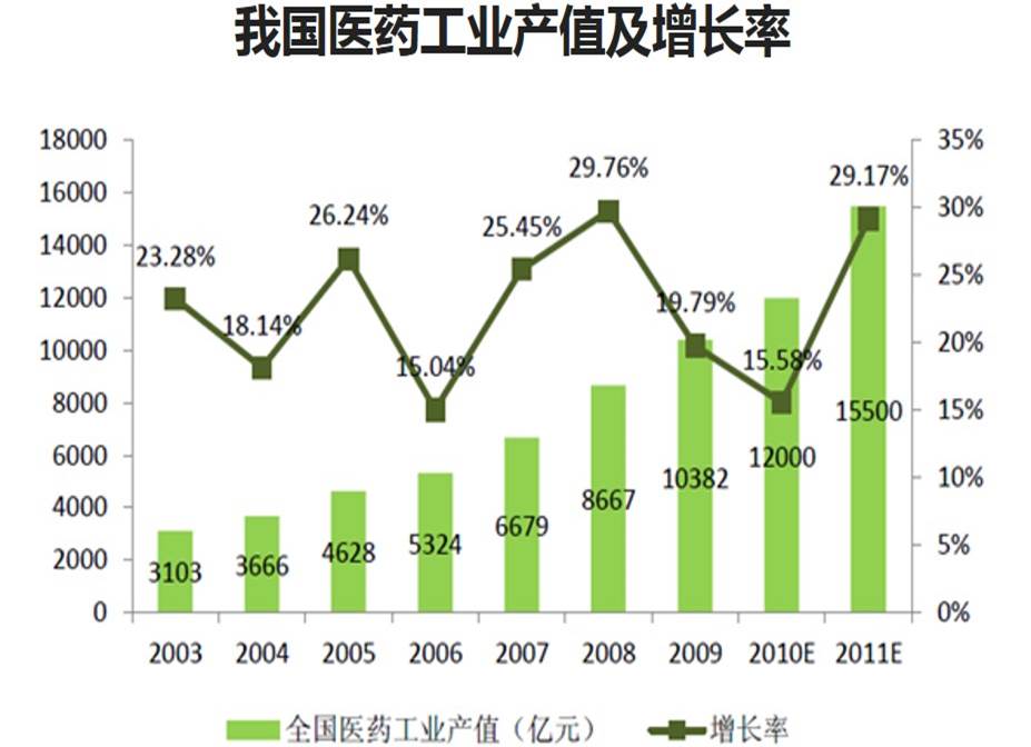 (4)发展快、竞争激烈。改革开放以来,随着人民生活水平的提高和对医疗保健需求的不断增长,医药工业一直保持着较快的发展速度,医药报告显示1978年至2000年,医药工业产值年均递增16.6%,成为国民经济中发展最快的行业之一。中国是全球人口最多的国家之一,由于人口众多产生了对医药行业质量和数量需求的增长,使中国已成为世界第五大药品市场和全球医药发展最快的市场,持续保持年均20%的增长率。根据医药行业市场调查报告数据,2011年中国医药产业总产值达1.5万亿元,较去年增长约28.5%,2012年1季度医药产业保持平稳增长态势,完成产值 3840.3亿元,同比增长22.7%。业内人士认为通过并购重组、优胜劣汰等方式进行产业链的整合,有利于解决产业集中度偏低、企业产品同质化等,推动行业的快速发展。
