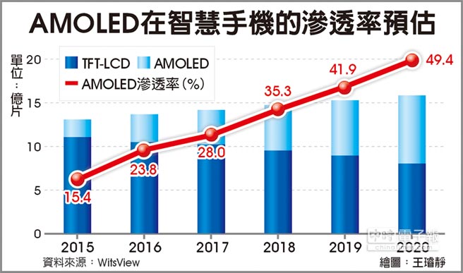 新一代苹果iPhone手机确定将採用三星AMOLED面板,因此吸引全球各家大厂抢进AMOLED市场,市调机构WitsView出具最新报告预估,AMOLED在智慧手机的渗透率可望在2020年飙近50%,而这一波投资热潮以中资最积极。至于韩厂乐金显示器(LGD)的6代可挠式产线将供应非苹客户,则最具指标意义。