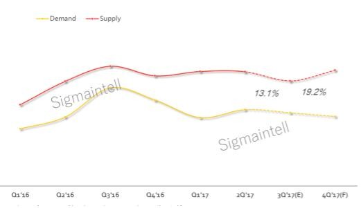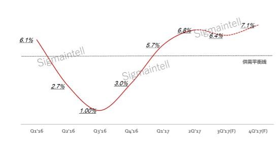 2016年Q1~2017年Q4全球电视面板市场供需关系走势