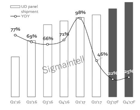 根据我们调查的数据来分析,全球4K电视面板出货量增速将从2017年三季度开始趋缓(如下图)。见微知著,目前全球大尺寸电视面板市场(55英寸及以上)中4K渗透率已达到近90%,市场增长点将从大尺寸向43’’~50’’的中尺寸段转移,但受到中尺寸需求低迷影响,我们预计未来两个季度4K增速将显著回落。