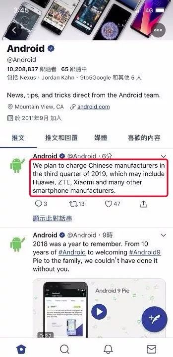 安卓官方推特账号发了一个消息,称第三季度将对国产手机厂商收取授权费,包括华为、小米、中兴等品牌。随后其官方推特便删除了这一个消息,但是已被网友截图。