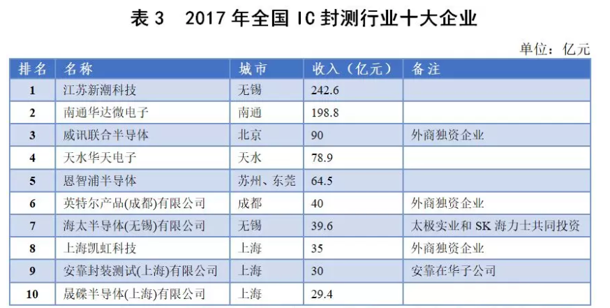 从Top10企业的收入和区域分布来看,全国IC封测业同样高度集中于少数几个城市。其中,无锡2家,占比33.3%;南通1家,占比23.4%;上海3家,占比11%;北京1家,占比10.6%。