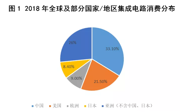 从规模上看,中美两国是当之无愧的集成电路大国。2018年,集成电路在亚太地区的销售额约为2376亿美元,占全球市场的比重高达60.34%,是全球最大的集成电路市场。其中,中国和美国已经成为全球半导体两个最大的消费市场,其市场规模占比分别为33%、22%(参见图1)。