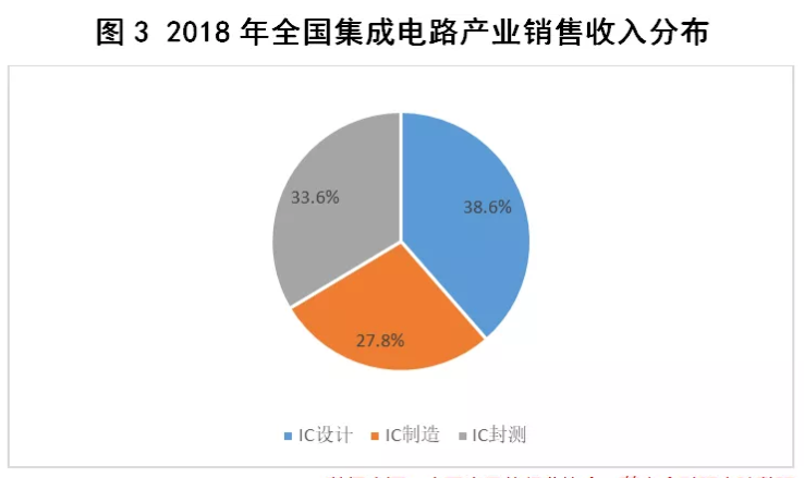 其中,IC设计、制造和封测三足鼎立。IC设计为2519.3亿元,占比38.6%;IC制造为1818.2亿元,占比27.8%;IC封测为2193.9亿元,占比33.6%(参见图3)。