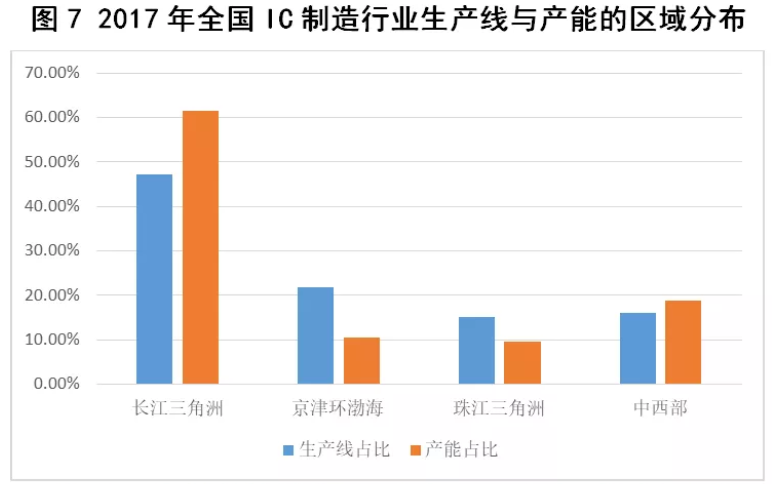 与IC设计业相比,中国IC制造业集中度相对较高。其中,长三角地区有50条,占47.2%,产能(折合8英寸,下同)占比61.4%;京津环渤海地区有23条,占21.7%,产能占比10.4%;珠三角地区有16条,占15.1%,产能占比9.5%;中西部地区有17条,占16%,产能占比18.7%。
