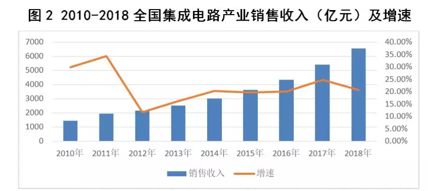 进入21世纪的19年来,中国IC产业快速发展,复合年均增速达到25%,远高于全球7.6%的增长水平(参见图2)。即便是在2018年,中国集成电路产业销售收入仍高达6532亿元,增长20.7%。