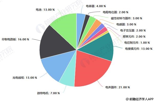 分产品来看,我国电子元件产品出口额最高的产品为电声器件,占进口总额的21%,其次为印制电路板和电接插元件,分别占比16%、13%。