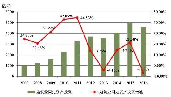 2007-2016年建筑业固定资产投资及增速