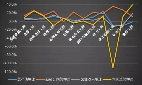 从利润总额来看,通信工程和公路工程的增长率遥遥领先,分别增长了40%和24%,同时远远超出其营业收入的增长速度,可见这两个领域今年在成本控制上表现突出,铁路工程在营业收入大幅增长的情况下,利润总额却下降了11%,增速比去年降低36个百分点,利润空间明显受到挤压,化工石油工程在去年出现4%左右的降幅后继续大幅下降,2016年负增长111%,出现了6.8亿元的巨大亏损,该类别企业承受的压力可见一斑。