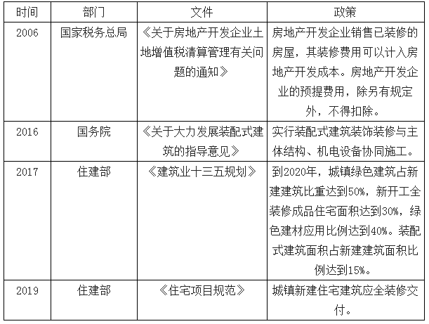 由于全装修住宅装修时通过开发商整体运行,能够较大程度的规范施工质量,降低造价成本,从而提升装修产业链效率。为此,国家以及各地方政府陆续推出相关政策,鼓励全装修市场发展。