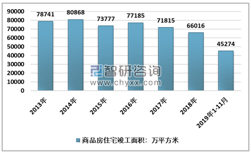 根据目前国内商品房住宅市场来看,2017年开始国内商品房住宅竣工面积略有下滑,但整体依旧处于高规模状态,2019年1-11月,房屋竣工面积63846万平方米,下降4.5%,降幅收窄1.0个百分点。其中,住宅竣工面积45274万平方米,下降4.0%。