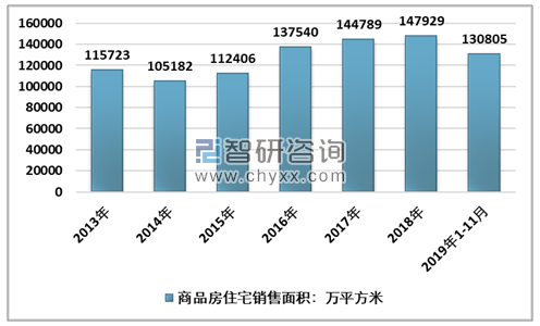 根据智研咨询发布的《2020-2026年中国全装修住宅行业市场经营风险及市场规模预测报告》数据显示:2016年至今,国内商品房住宅销售面积开始逐步回升,2018年全国商品房住宅销售面积增至147929万平方米,同比增长2.17%,截至2019年11月,国内商品房住宅销售面积130805.13万平方米,相比2018年同期增长了1.62%。