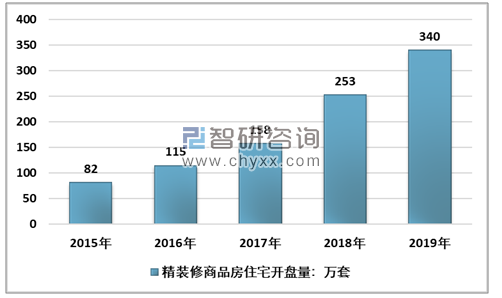 2018年全国精装修商品房住宅开盘量253万台,同比增长60.13%,相比2015年的82万台精装修住宅,国内精装修市场已经增长了3倍之余,随着2019年住建部出台的《住宅项目规范》,国内商品房住宅精装修开盘套数约为340万套。
