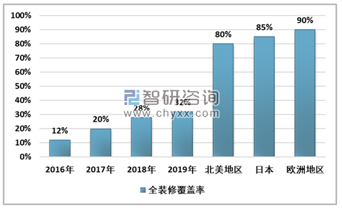渗透率方面,我国全装修覆盖率不足三分之一,2016年仅12%,2018年全装修覆盖率28%,2019年约为32%,虽然近几年增速明显,但对比全球发达国家和地区相比,我国全装修覆盖率存在明显劣势。