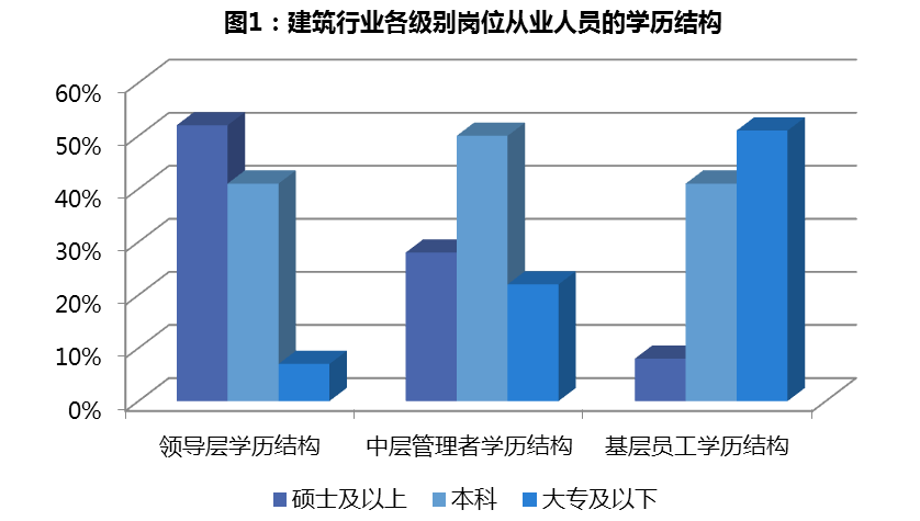 我国建筑行业从业人员的构成主要有管理人员、技术人员以及施工人员。在总体结构中管理人员和技术人员所占比例较小,如表1 所示,管理人员约占1.7%-3.0%,技术人员约占20%,而施工人员在所有职工中占绝大多数的比例。建筑行业各等级职工中的学历分布也呈现出一定的特点,图1 显示企业领导层中硕士及以上学历的人才占比重较大,中层管理人员中大学学历人才占比重较大,而基层员工大专学历的人才较多,中基层从业人员的整体素质不高。