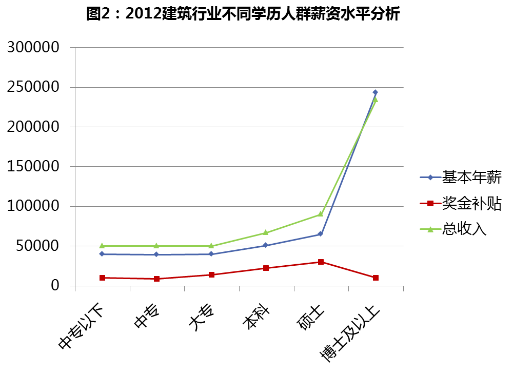 如图2 所示,建筑行业不同学历人群基本工资水平差距较大,以本科为分界线,本科以下工资基本在5000元左右,本科以上工资上升很快。硕士以及硕士以上学历的从业的基本工资和总收入水平较高,工资达到2万到2.5万之间。但是奖金补贴与学历的关系不明显,在不同学历从业人员中数额基本稳定,保持在5000元以下。