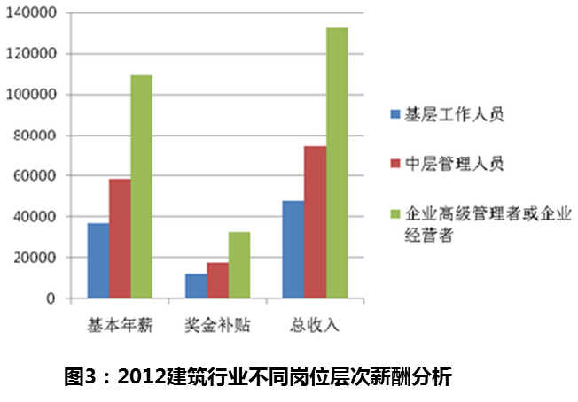 调查显示,建筑企业内部基层工作人员、中层管理人员和企业高管以及经营者的薪酬水平差距较大。企业高管以及经营者的基本年薪、奖金补贴以及总收入都高于中层管理人员和基层工作人员,基本年薪在10万元以上,总收入在13万元左右,而基层工作人员的基本年薪低于4万元,总收入低于5万元。