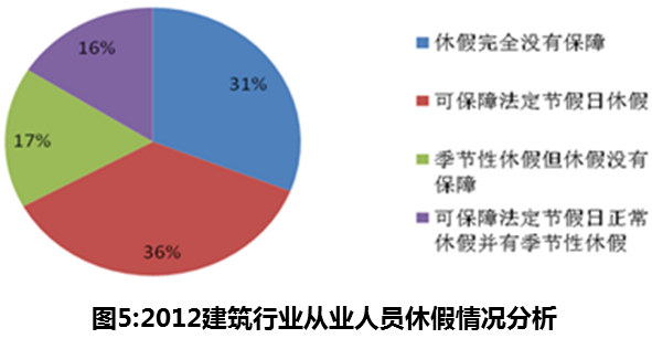 图5 显示为建筑行业从业人员享受休假制度的情况。数据显示,16%的员工表示可保障法定节假日并且有季节性休假,53%的从业人员表示可保证法定假日或季节性休假没有保障,但是仍然有31%的员工不能保证休假。