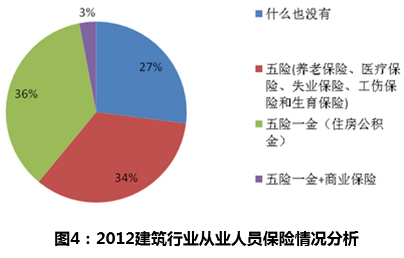 图4 显示为建筑行业从业人员享受保险的情况。调查显示,70%的从业人员享受基本的保险,其中36%的人员享受五险,34%的员工享受五险一金。但是仍然有27%的员工不享受任何保险。这说明我国建筑行业从业人员在享受保险方面仍然不够完善。