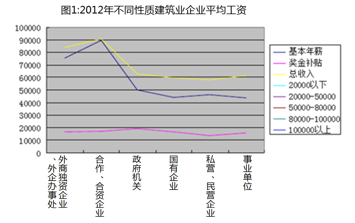 我国建筑企业的性质类型比较多样,包括国有企业、事业单位、大型及中小型民营企业以及外资企业。调查显示,不同性质的建筑业企业的薪资水平差异比较明显。如图1 所示,外企和合作企业的基本年薪高于其他企业,工资总水平也远高于国有企业、私有企业、事业单位,年薪基本上位于在 8-9 万左右。而奖金补贴在不同性质企业中波动不大,基本位于 1.6 万元左右。外企和合资企业的薪酬待遇优于国企、私企和事业单位。