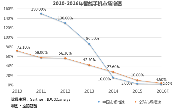 自2010年以来,全球和中国智能手机市场增速持续下降。IDC数据显示,2016年第一季度全球智能手机出货量与去年同期相比仅增长0.2%,创下历年来最小同比增幅。Canalys数据则显示,这一时期全球智能手机出货量低于去年同期,自1996年智能手机诞生以来全球出货量首次出现同比收缩。尽管二者数据有异,但全球智能手机市场增速下降的趋势是一致的。