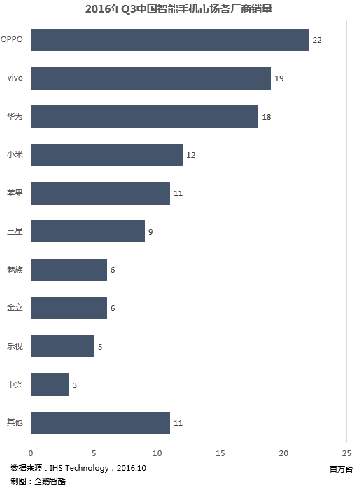 IHS Technology数据显示,2016年第三季度中国智能手机市场销量为1.23亿台,较去年同期增长15%。OPPO首次成为中国智能手机市场的季度排名第一,vivo凭借X7的热销排名第二,华为(含荣耀)排名第三,小米和苹果分列第四、第五。三星则由于note7爆炸事故而被甩出了中国市场前五。