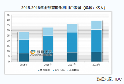 近年来,全球智能手机用户规模迅速壮大。根据 IDC 的统计数据, 2015 年至 2017年间,全球智能手机用户数量从 28.71 亿增长到 36.66 亿,年均复合增长率为 13.0%。其中,中国境内的智能手机用户从8.08亿人增至9.24亿人。
