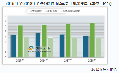 全球智能手机出货量延续增长的态势,其中新兴市场增长率最高。根据统计数据, 2015 年至 2017 年全球智能手机出货量从 14.38 亿台增长至 14.65 亿台,年均复合增长率为 1.0%。受印度等新兴市场增长的推动,预计至 2022 年,全球智能手机出货量将达到 16.54亿台。