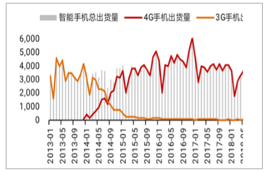 4G商用落地后,4G手机终端渗透率不断攀升:4G发展初期阶段,随着中国4G牌照发放、4G正式落地商用化,中国第一批4G手机出货,新上市的4G新机型手机数量逐步增长。2014年5月,当月上市的3G新机型手机为92款,而上市的4G新机型手机96款超过了3G。同时,3G手机出货量持续下滑,4G手机出货量开始放量,在4G牌照发放后8个月,2014年9月,4G手机出货量正式超过3G手机,标志着4G手机成为市场主流。