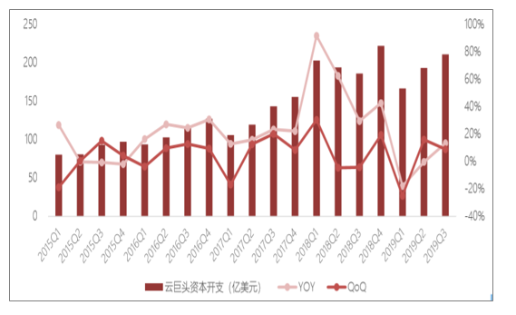 北美五大云巨头(亚马逊、谷歌、微软、苹果、Facebook)2019年Q3整体资本开支增速改善显著,拐点进一步确立,有望带动云产业链重回高增长轨道。北美五大云巨头资本开支增速从2015年Q2开始下滑,2015年Q4开始触底反弹,历经12个季度的快速增长,2018年Q1和Q2达到顶峰,增速分别达到91.9%、62.6%。从2018年Q2开始,受到宏观经济放缓、去库存、4G应用逐步成熟等因素的影响,增速开始回落,云厂商相继下调资本开支指引,2019年Q1,云巨头资本开支增速同比下降17.9%,环比下滑24.9%,达到2013年以来的季度增速最低值。进入到2019年Q2,云巨头资本开支增速有所回暖,同比轻微下滑0.3%,环比增长16.0%,2019年Q3,云巨头资本开支增速改善显著,同比增长13.4%,环比增长9.0%。预计海外云巨头资本开支增速未来有望持续改善。