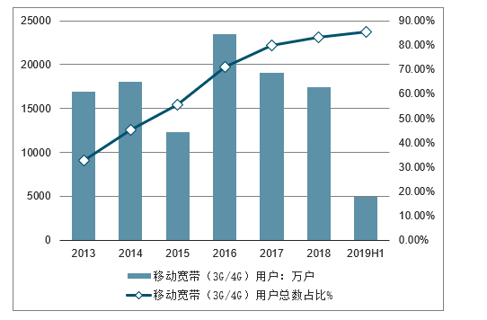 2013-2019年移动宽带(3G/4G)用户发展情况(单位:万户,%)