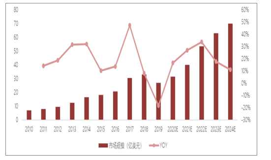 在100G和400G光模块的带动下,以太网光模块有望走出周期底部。北美数据中心仍处于高速发展中,100G需求仍较为强劲,客户对100G等高速光模块需求仍持续增长,同时新的400G需求也不断增加,预计北美云巨头将在今年年底开启400G光模块大规模集采,明年数通市场将正式进入400G时代,有望带动光模块企业重回业绩高增长快道。根据最新报告,受到云计算厂商资本开支下降影响,以太网光模块2019年市场规模约27亿美元,同比下降18%,预计2020-2024年市场规模有望快速反弹,在2024年有望达到70亿美元市场规模。