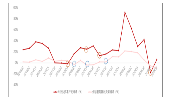 全球资本开支增速比服务器出货量增速提前1-2个季度见底