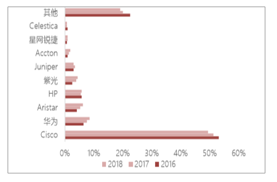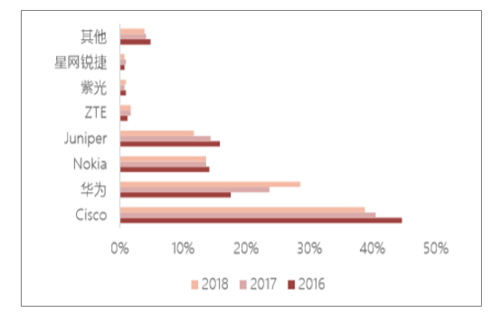 企业级网络设备行业集中度较高,呈现寡头垄断的竞争格局,思科、华为、新华三等少数几家企业占据绝大部分市场份额。网络安全内涵逐渐延伸,信息产业自主可控,网络设备需先行,国内高端企事业客户均有不同程度使用国内企业产品的意愿,实现核心软硬件的完全自主可控在是产业的未来发展方向,网络设备国产替代加速发展,利好国内网络设备厂商。
