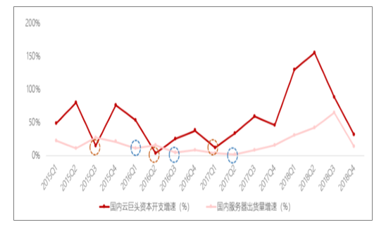 国内资本开支增速比服务器出货量增速提前1-2个季度见底