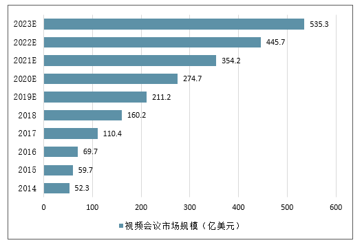 云视频会议尚处于初期发展阶段,未来空间较大。从全球视角来看,2018年全球视频会议市场规模约百亿美元,据预测,未来增速都在10%左右,市场增速明显放缓,同时全球视频会议龙头厂商收入增速也明显放缓,而全球云视频会议领导者Zoom保持快速发展。从我国发展情况来看, 2017年中国视频会议市场规模为110.4亿元,同比增长58%,预计2018-2023E年复合增长率为30%,增速高于全球。