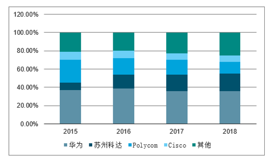 基于硬件的传统视频会议市场较为集中,格局稳定,以华为、苏州科达、中兴通讯、视联动力、宝利通等企业为主,多年来,硬件视频会议系统近80%的市场份被华为、苏州科达、Polycom、Cisco占据。