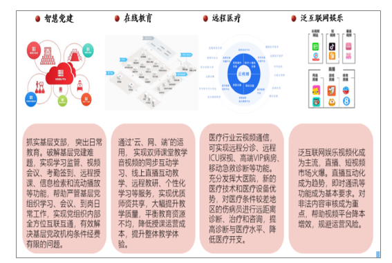 云视频+应用”打破视频会议边界,市场空间有望达千亿。云视频应用有望从基础视频会议向泛互联网和传统行业延伸,云视频和各行业的融合加深,从泛娱乐领域扩展到在线教育、远程医疗、视频监控、社交应用等多个场景。
