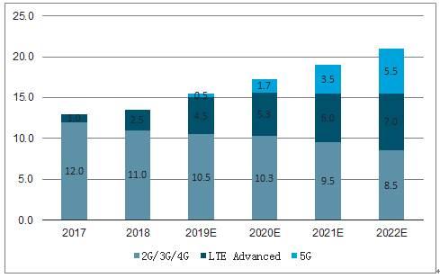 2019年全球智能手机出货量预计会持续下滑,约为14亿台。其中5G智能手机670万台,到2023年,有望达到40130万台。