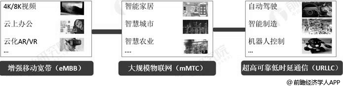 根据国际电联(ITU)对的5G愿景,5G将主要面向三大应用场景:增强移动宽带(Enhanced mobile broadband,eMBB)、超高可靠低时延通信(Ultra-reliable and low latency communications,URLLC)和大规模物联网(Massive machine type communications,mMTC)。