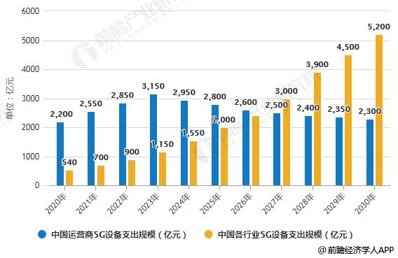2020-2030年中国运营商及各行业5G设备支出规模预测情况