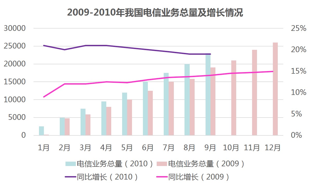 2010年1~9月,全国电信业务总量累计完成22748.9亿元,比上年同期增长20.8%,增速较去年同期扩大了7.4个百分点,全国电话用户净增917.3万户,总数达到113457.0万户。
