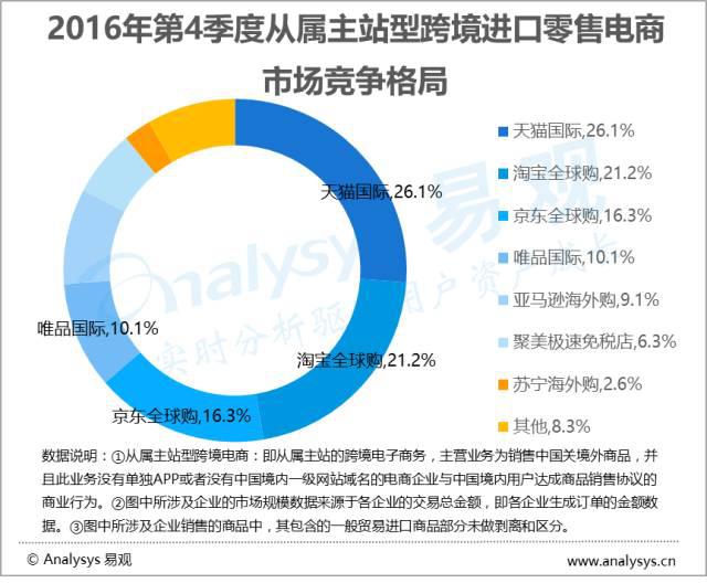 1.跨境电商寡头格局已经形成,以阿里系(包括天猫国际和淘宝全球购)、京东的垄断力量为代表,其中京东全球购与第一名的天猫国际市场份额相差7个百分点,寡头间竞争开始日益白热化;