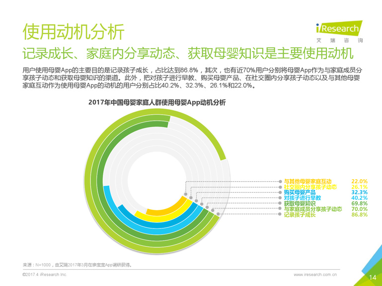 一个来自艾瑞的数据可以印证你的观点,《2017年中国母婴家庭人群白皮书》(下文简称“白皮书”)显示,母婴家庭人群(拥有一个0-6岁儿童)中妈妈人群主要集中在26-30岁,爸爸则是31-40岁。根据《白皮书》分析,家长们使用母婴App的前三名诉求是记录成长、家庭内分享动态、获取母婴知识,购买母婴产品反而排至第五。